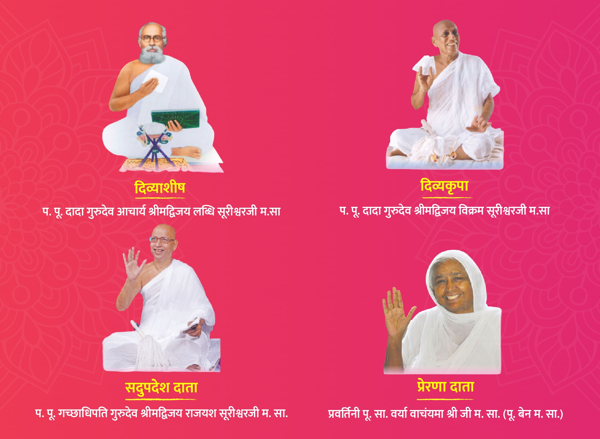 प.पू. दादागुरुदेव आचार्य श्रीमद्विजय लब्धि सूरीश्वरजी म. सा. के दिव्याशीष प. पू. गुरुदेव आचार्य गीतार्थ श्रीमद्विजय विक्रम सूरीश्वरजी म. सा. की दिव्य कृपा से प. पू. गच्छाधिपति गुरुदेव श्रीमद्विजय राजयश सूरीश्वरजी म. सा. की प्रेरणा से और सदउपदेश से प. पू. प्रवर्तिनी साध्वीवर्या वाचंयमा श्रीजी म. सा. (प. पू. बेन म. सा. ) की पावनप्रेरणा से तथा जिन शाशन के समस्त श्रमण श्रमणी भगवंतो के परम पावन निश्रा में हमने विश्व शांति एव जैन धर्म के गौरव और एकता के लिए विश्व मे सर्व प्रथम बार १,११,१११ आयंबिल सामूहिक विराट आराधनाका शुभ आयोजन किया है।