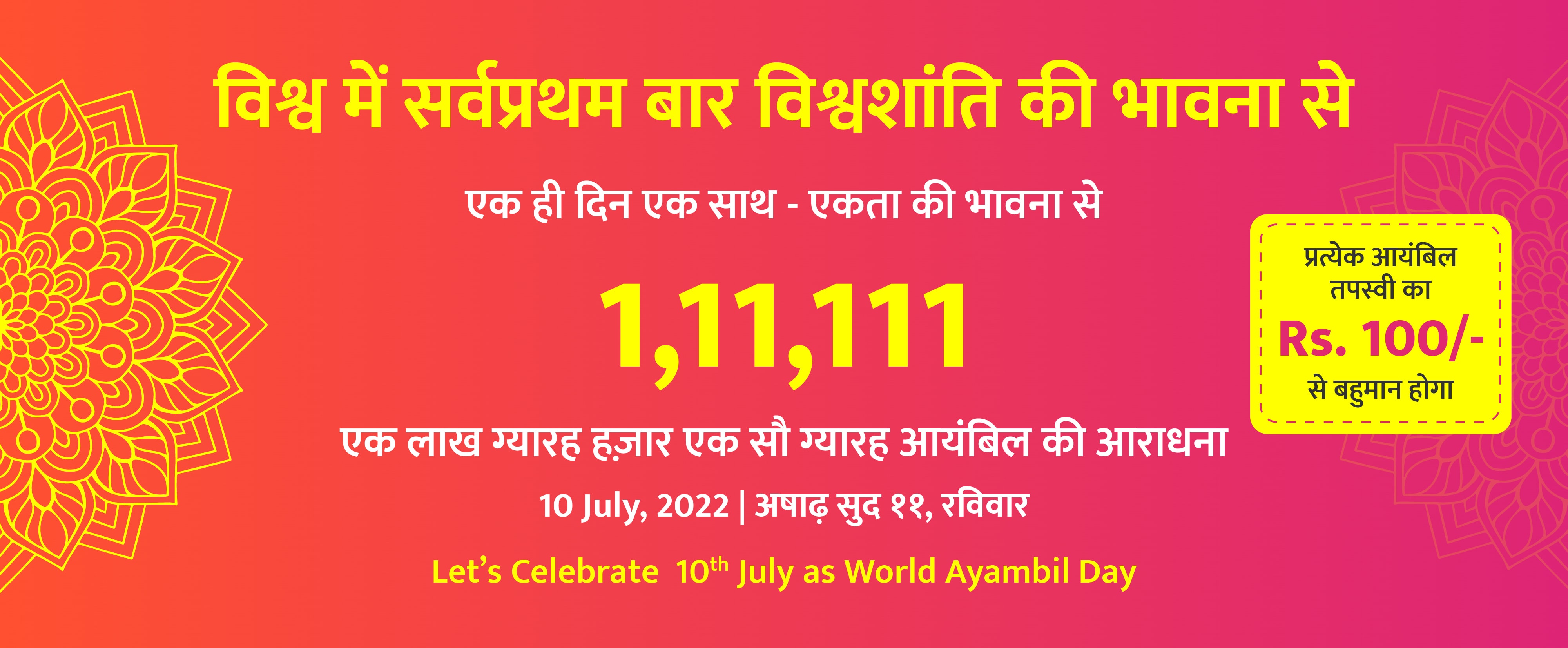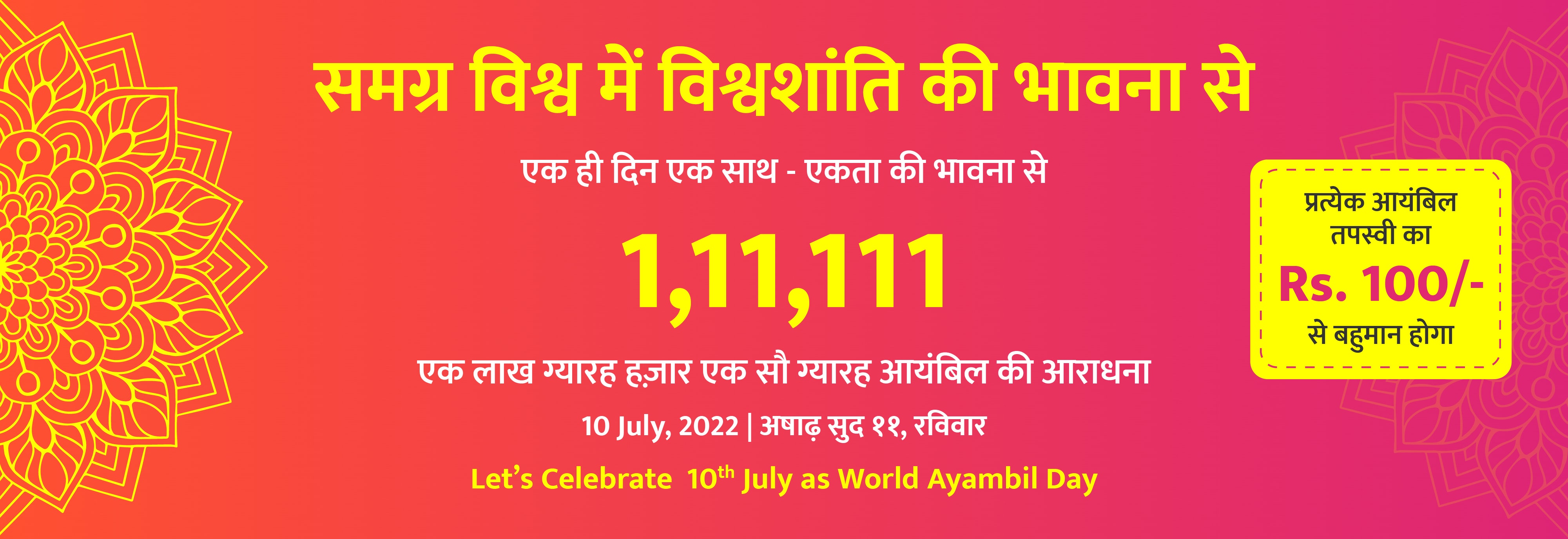 "आप सज्ज हो जाये.... आपको सिर्फ एक ही आयंबिल करके एक लाख ग्यारह हजार एक सौ ग्यारह आयंबिल के अभियान में सहभागी बनना है।"