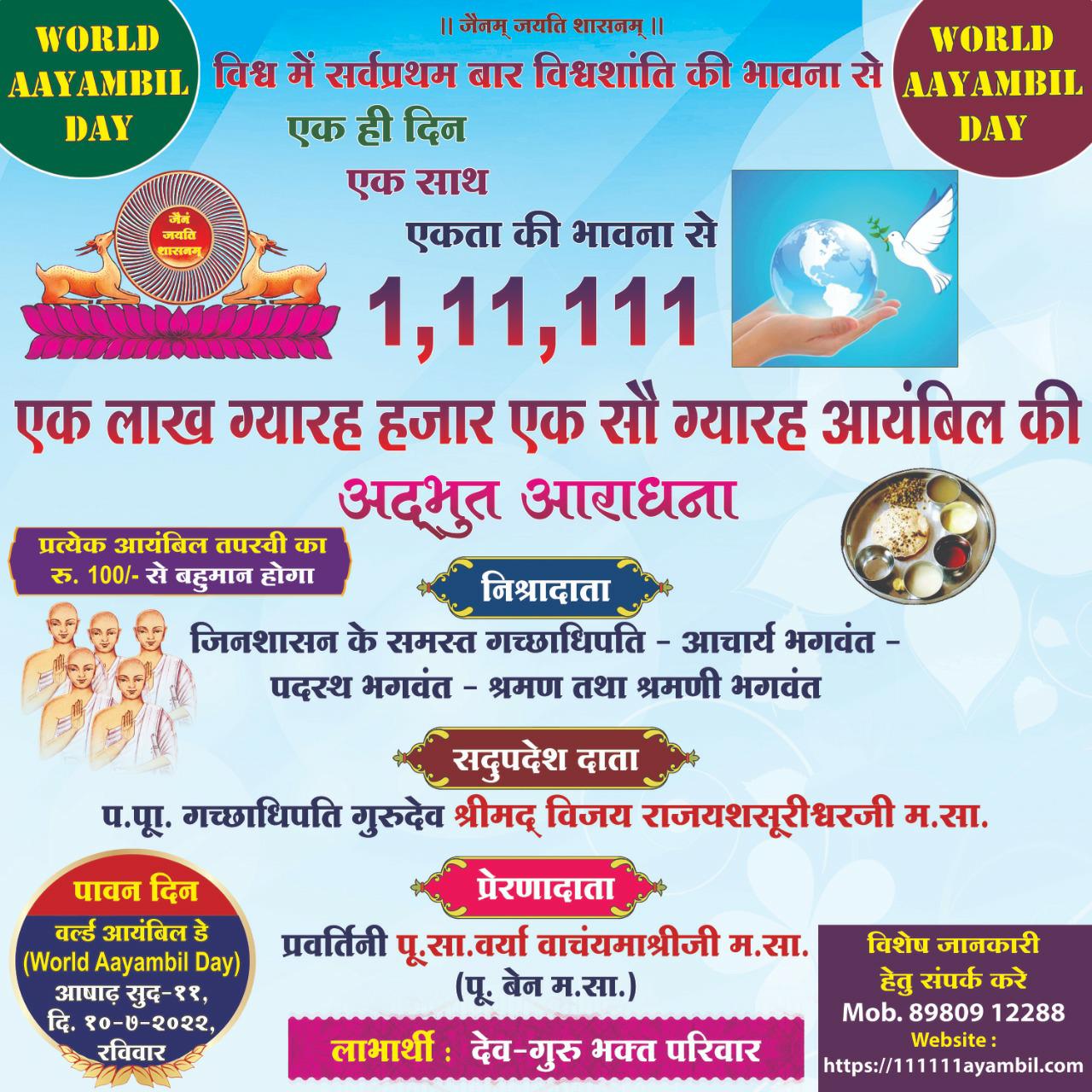 प.पू. दादागुरुदेव आचार्य श्रीमद्विजय लब्धि सूरीश्वरजी म. सा. के दिव्याशीष प. पू. गुरुदेव आचार्य गीतार्थ श्रीमद्विजय विक्रम सूरीश्वरजी म. सा. की दिव्य कृपा से प. पू. गच्छाधिपति गुरुदेव श्रीमद्विजय राजयश सूरीश्वरजी म. सा. की प्रेरणा से और सदउपदेश से प. पू. प्रवर्तिनी साध्वीवर्या वाचंयमा श्रीजी म. सा. (प. पू. बेन म. सा. ) की पावनप्रेरणा से तथा जिन शाशन के समस्त श्रमण श्रमणी भगवंतो के परम पावन निश्रा में हमने विश्व शांति एव जैन धर्म के गौरव और एकता के लिए विश्व मे सर्व प्रथम बार १,११,१११ आयंबिल सामूहिक विराट आराधनाका शुभ आयोजन किया है।